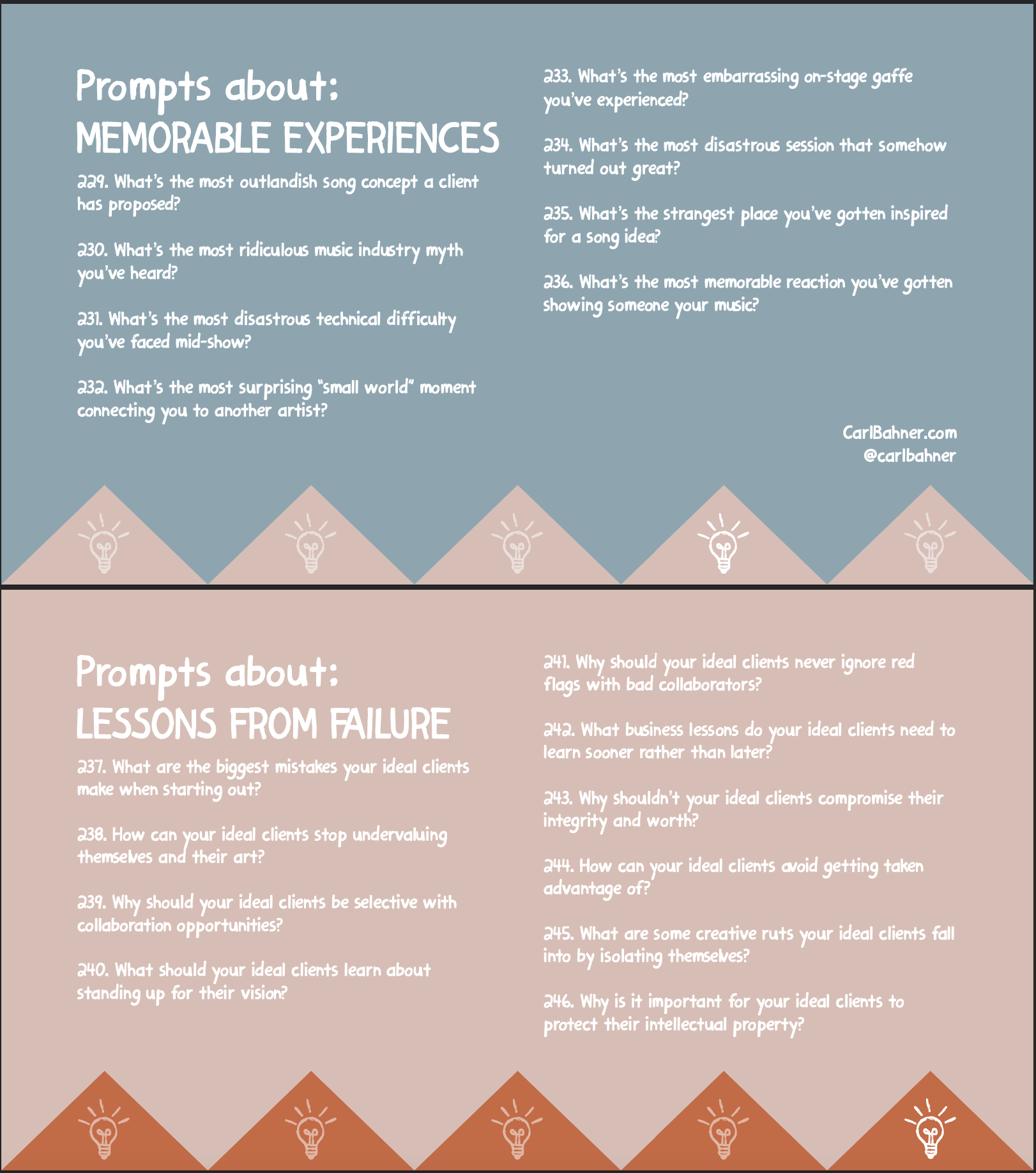 I’ve compiled a list with literally HUNDREDS of prompts to help studio pros like you express YOUR unique tastes, experiences, and perspectives.